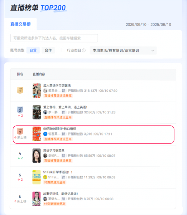 2025年9月10日,正值教师节来临之际,国内知名在线英语教育平台——说客英语特别推出“教师节99元9课时外教一对一限时特惠套餐”,以实惠的价格和优质的教学资源回馈新老用户,活动一经推出便受到广泛关注及抢购热潮。活动上线小时内订单量突破百单,抖音直播间更是一举冲上当日教育品类榜...